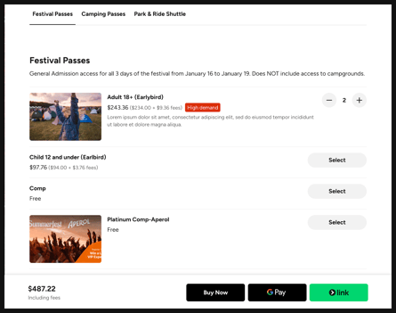 Express Checkout makes buying tickets faster, easier, and more secure for customers. By leveraging trusted services like Google Pay, Apple Pay, and Link, customers can skip lengthy checkout flows and complete their purchase in just a few clicks, increasing conversion rates by up to 10%.