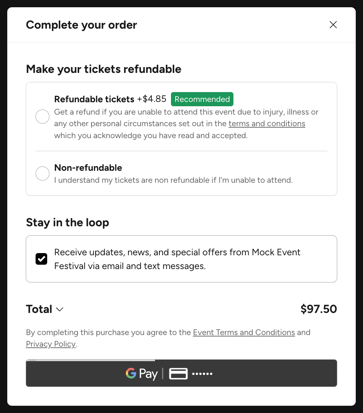 - Supported Payment Methods - Express Checkout supports Apple Pay, Google Pay and Link payments. These options will automatically appear at the bottom of the event page if: