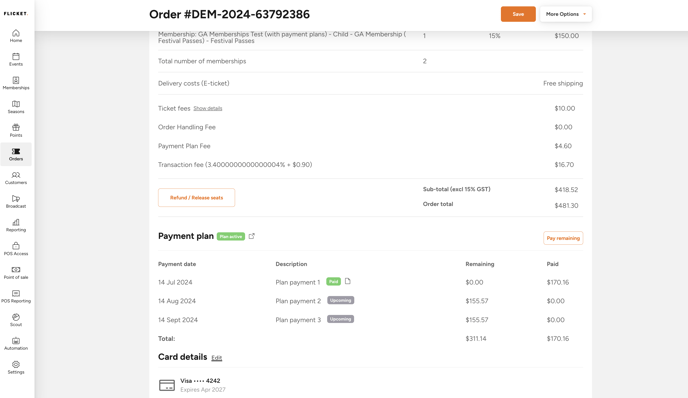 - Payment plans can be used for both Reserved Seated Events Memberships and General Admission Memberships.