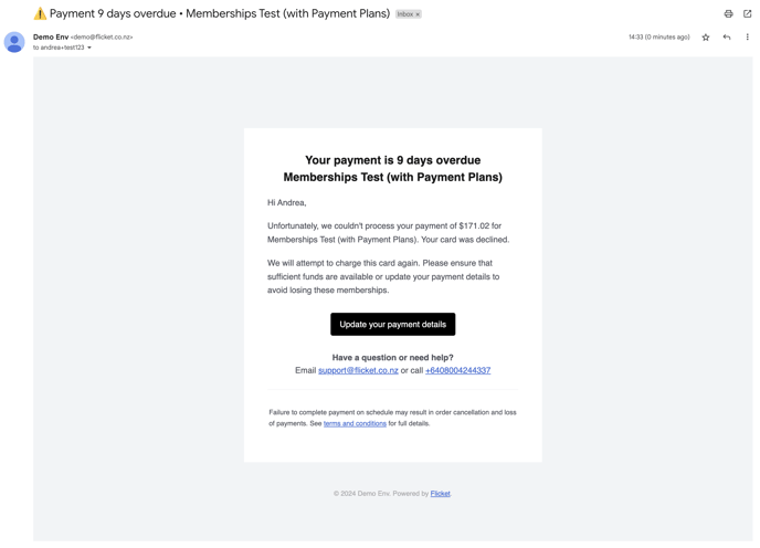 For any payment failure, we will automatically retry charging the card 8x within 2 weeks before Stripe ends the payment plan. This causes the payment plan to be in a ‘paused’ state in Flicket. Once the plan has been paused, you will need to take action with the customer on next steps, e.g. cancel the order and manually release the tickets back into capacity, or some other resolution.